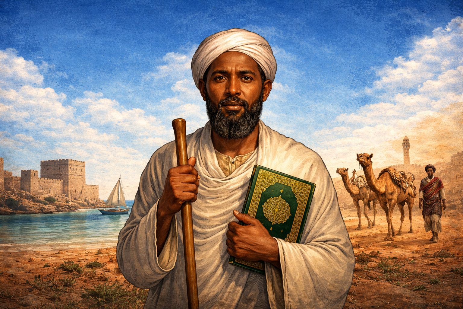 Si aan u helno shaqsigaas la illoobay, waa inaan u jeedsannaa koonfurta, xeebaha quruxda badan ee Geeska Afrika. Halkaas, qarnigii 14aad, Magaalada Muqdisho waxay ahayd xarun ganacsi, aqoon iyo diinta Islaamka. Ma ahayn magaalo yar oo la illoobay, balse waxay ahayd magaalo firfircoon oo ay ku kulmaan ganacsato ka imaanaysa Carabta, Faaris, Hindiya iyo Afrika, iyagoo is dhaafsanaya alaab, fikrado iyo dhaqamo. Magaalada waxaa ka muuqday qubbadaha iyo minaaradaha masaajidda, halka hawada ay ka buuxaan urta badda, alaabo ganacsi iyo hadallada culimada ee doodaha aqooneed.